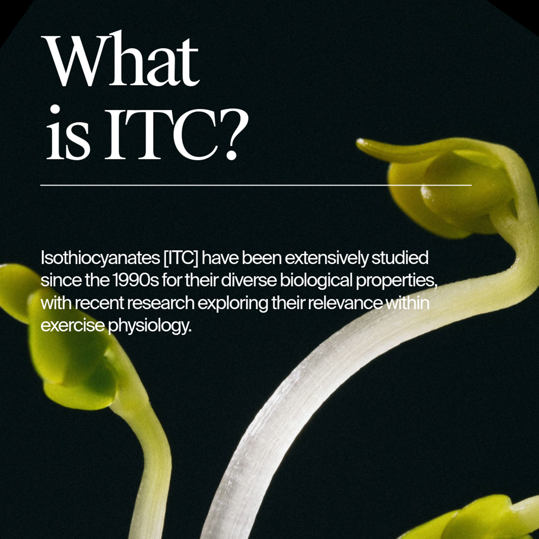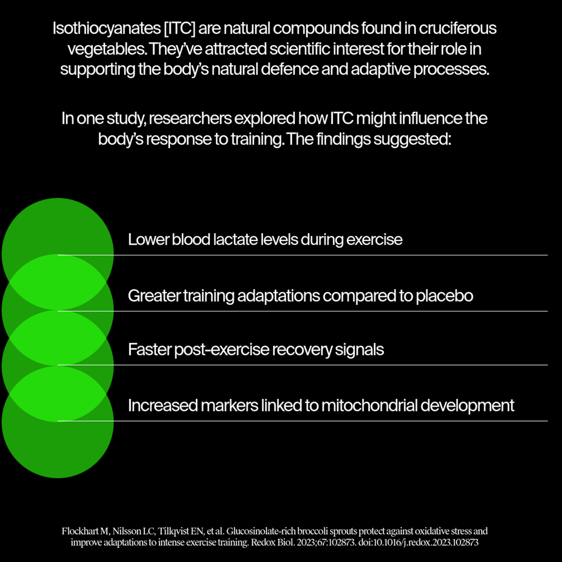 ITC is a known activator of NRF2, the body's master regulator system of stress. Activation of NRF2 prepares the body for physical stress, allowing it to better manage exercise and exhaustion. In training, it's linked to a reduction of lactate, oxidative stress, and faster training adaptations. It also improves your ability to handle high training loads, and recover faster.